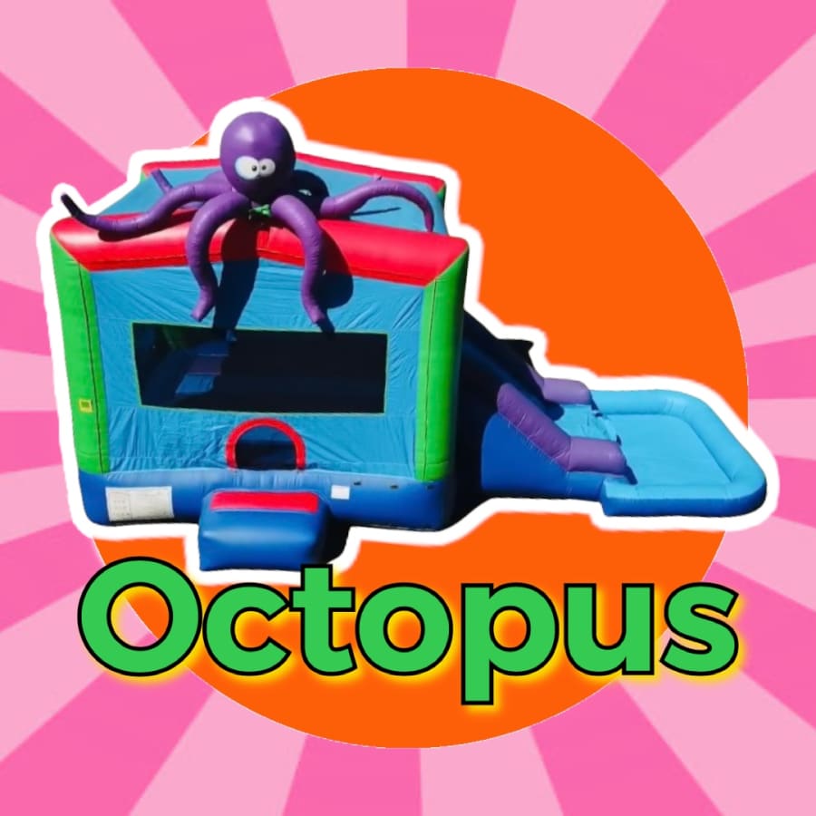 Want a wet part or dry party? Either way our Octopus unit is a great choice seeing that it can fulfill both! Not only does this have a slide that is equipped a sprinkler system, but it also has a POOL! This unit makes it easy for kids to have fun on a hot day! But that is not all. Our 15x12 Octopus unit also has a basketball goal inside. Wet or dry and kids will have loads of fun!
